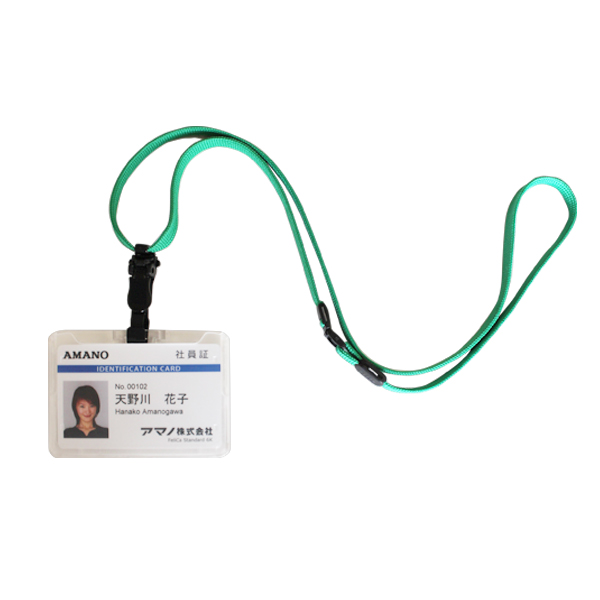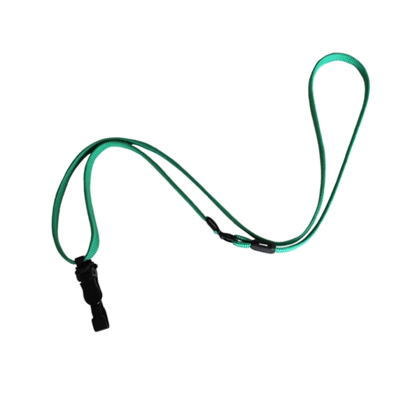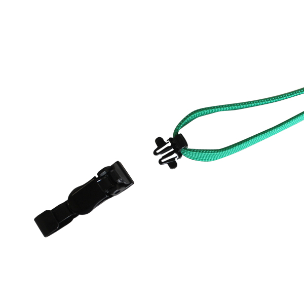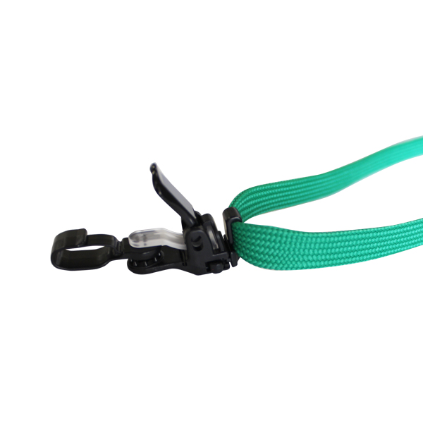 【緑色】長さ調整スライダーと先端に脱着式のプラスチック製クリップがついたストラップです
